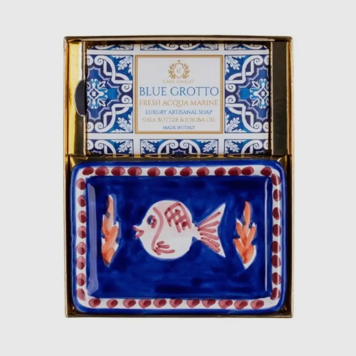 Casa Amalfi luxury artisanal soaps - Gift box set of one soap with hand painted ceramic soap dish holder. The sensuous freshness of white figs and summer peaches is wrapped in a bouquet of white freesias and lavender cream enriched with luxurious shea buyer and jojoba oil. The richly fragranced foam gently cleanses and scents the skin leaving it feeling hydrated and silky smooth. A magical and unique perfume that transports you as in a dream to Capri.
